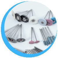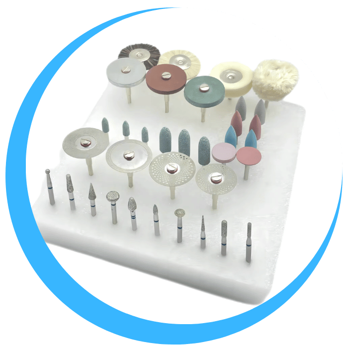 Our kit includes a wide variety of tools, from diamond burs to fine polishers, designed to cover all clinical and laboratory needs in the finishing of dental prostheses.